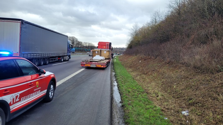 Um 11.44 Uhr wurden die Einsatzkräfte auf die Autobahn 1 gerufen. Kurz vor dem Rastplatz Bruchmühle in Fahrtrichtung Köln war ein LKW auf einen zweiten LKW aufgefahren. Die Feuerwehr sicherte die Einsatzstelle gegen den fließenden Verkehr und stumpfte auslaufende Betriebsmittel ab. Ein LKW Fahrer verletzte sich bei dem Aufprall leicht. Nach einer Behandlung durch den Rettungsdienst konnte er vor Ort belassen werden. Die Feuerwehr übergab nach ca. 60 Min. die Einsatzstelle an die Autobahnpolizei. Die Feuerwehr Gevelsberg war unter Leitung des diensthabenden Einsatzleiters Peter Dietrich mit 17 Kräften auf der Autobahn im Einsatz.