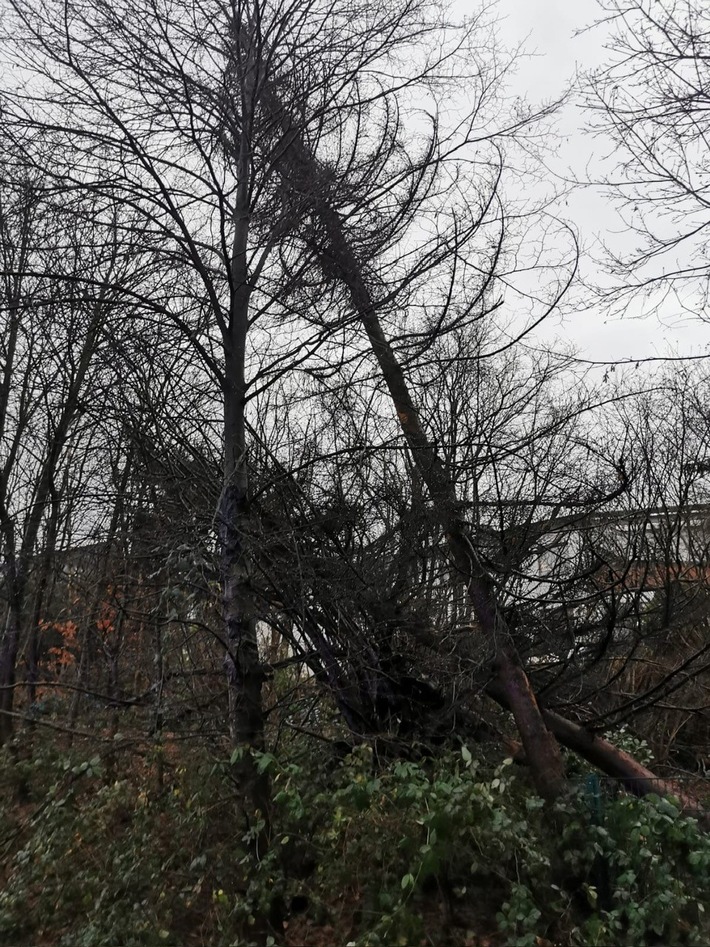 Am späten Nachmittag mussten Am Kotten noch zwei Bäume gefällt werden. Durch Wind und den aufgeweichten Boden wurden die Bäume samt Wurzelteller in Schräglage gebracht, hingen ineinander und drohten auf die Straße zu fallen.