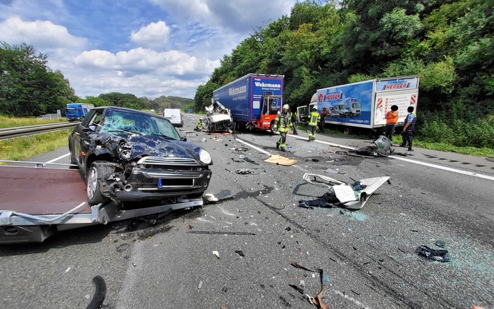 Gevelsberg (ots) -Am Montag, den 20.06.2022 wurde die Feuerwehr Gevelsberg um 14:08 Uhr zu einem schweren Verkehrsunfall auf die Bundesautobahn 1 in Fahrtrichtung Bremen alarmiert. Hier kam es zu einem Zusammenstoß zwischen drei Lastkraftwagen sowie zwei PKW.